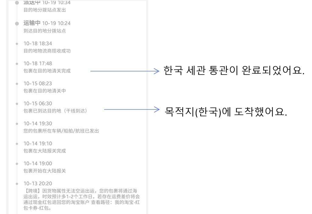 다음에서 보여주는 중국어 배송 상태로 내 제품이 어디까지 와 있는지 알 수 있습니다. 아래서부터 위 흐름대로 순서가 진행됩니다.