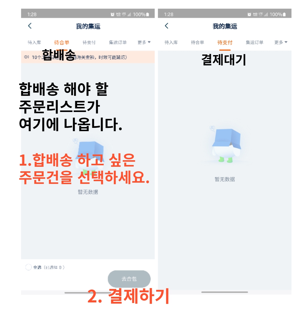 결제 기한 넘기지 않고, 합배송비 결제하기 : 나의 타오바오 - 합배송 메뉴를 클릭해요.