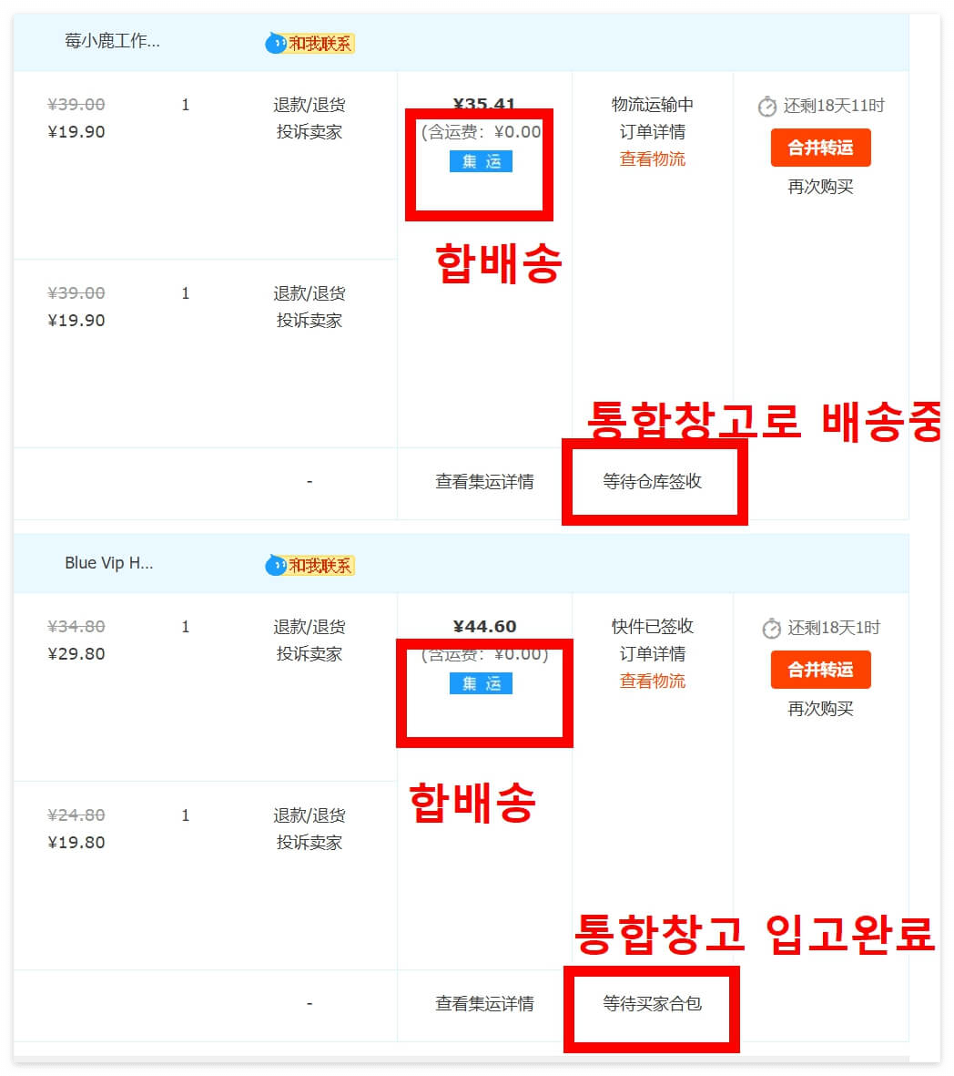 타오바오에서 주문을 하면 합배송을 해야 할 수량, 통합창고에 도착한 수량을 확인할 수 있어요. 간혹 이 숫자를 보지 않고 내가 구매한 숫자를 누락한 채, 합배송 신청을 하는지 주의해야 해요.