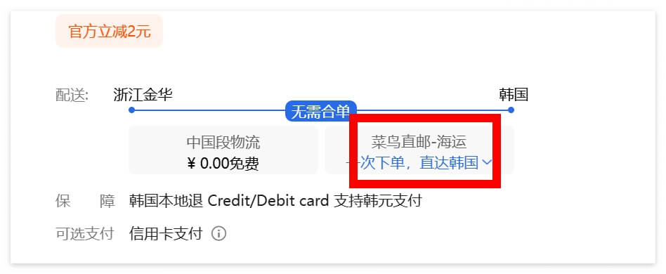 상품을 구매하겠다고 생각할 때는 한국직배송 直邮 방식의 안내 메시지를 봤는데, 실제 구매할 때는 직배송이 아닌 '합배송'을 선택한 거죠.
