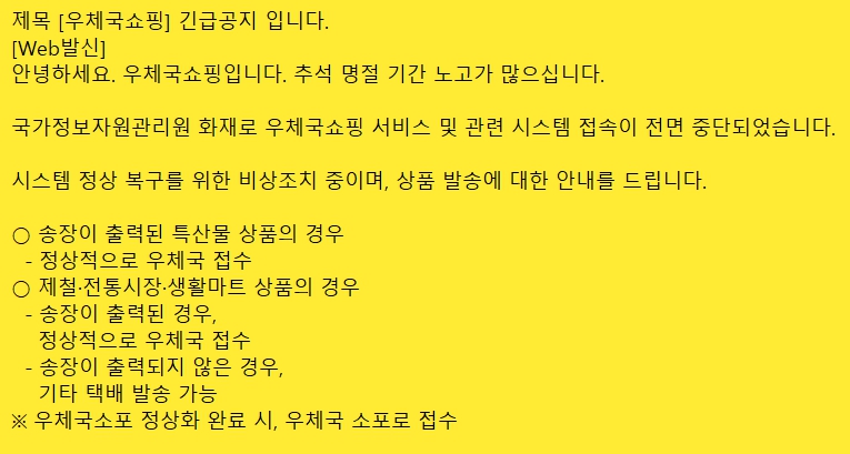 국가정보자원관리원 화재로 우체국쇼핑 서비스 및 관련 시스템 접속이 전면 중단되었습니다.
