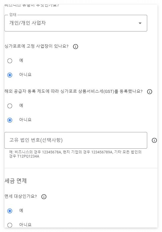 비즈니스 유형을 선택한다. 나는 개인이고, 싱가포르 고정사업장이 없으므로 '아니오'로 기재하였다.
