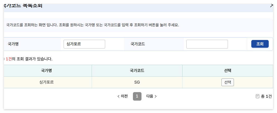 발급대상국은 [싱가포르]를 검색하여 선택합니다.