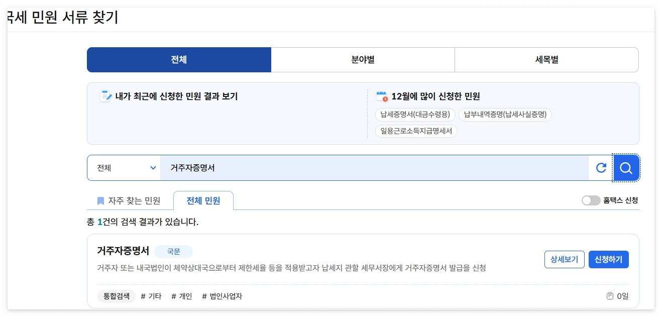 홈택스에 로그인을 한 후, [국세증명,사업자등록 세금관련 신청신고] → [국세민원서류찾기] → [거주자증명서 검색] 신청하기를 누릅니다.