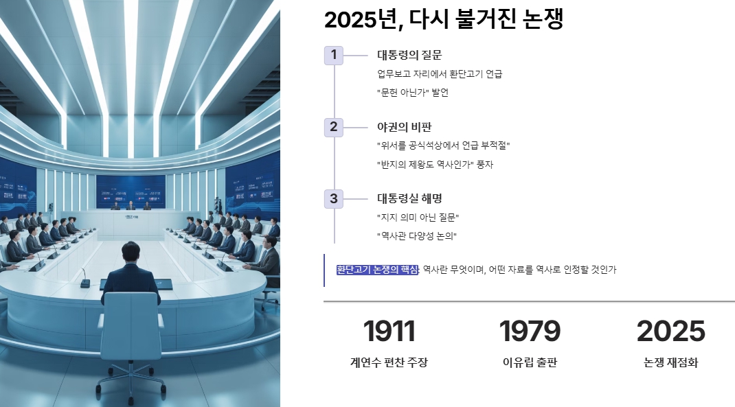 2025년 12월, 이재명 대통령이 공적 자리에서 환단고기를 언급하면서 다시 주목받았습니다. 대통령은 업무보고 자리에서 환단고기를 “문헌 아닌가”라며 질문했고, 이것이 역사 인식의 차이를 드러낸다고 언급했습니다.