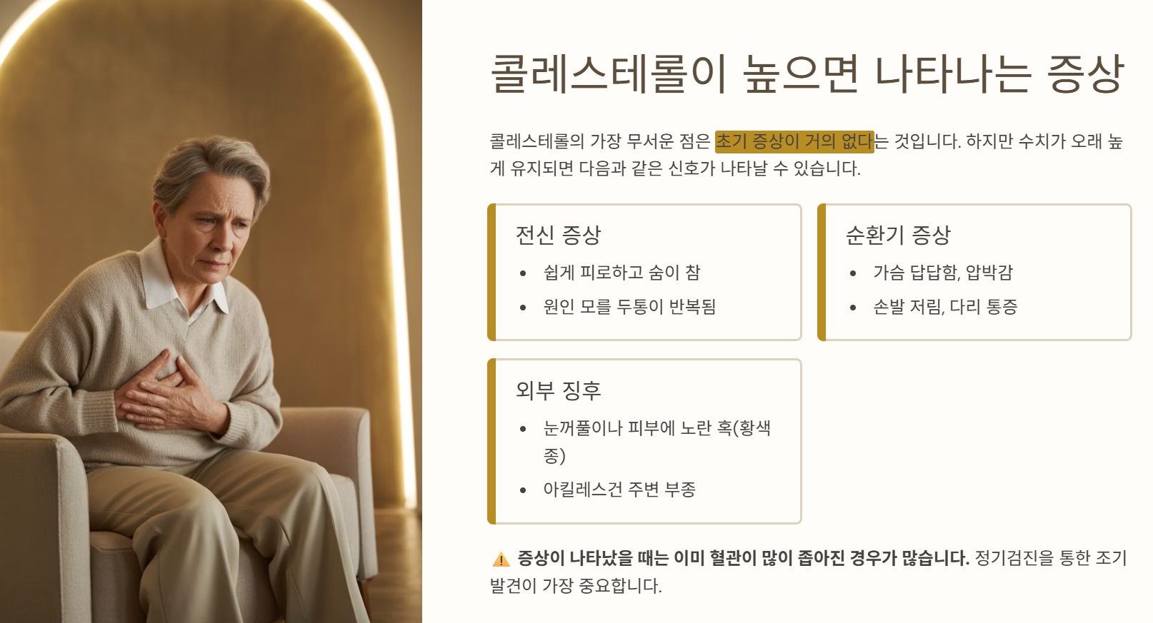콜레스테롤의 가장 무서운 점은 초기 증상이 거의 없다는 것입니다. 하지만 수치가 오래 높게 유지되면 다음과 같은 신호가 나타날 수 있습니다.