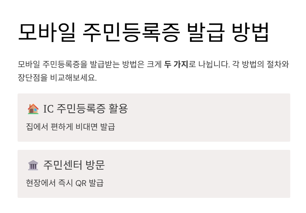 발급 방법은 IC 주민등록증 방식과 주민센터 QR 방식 두 가지가 있습니다.